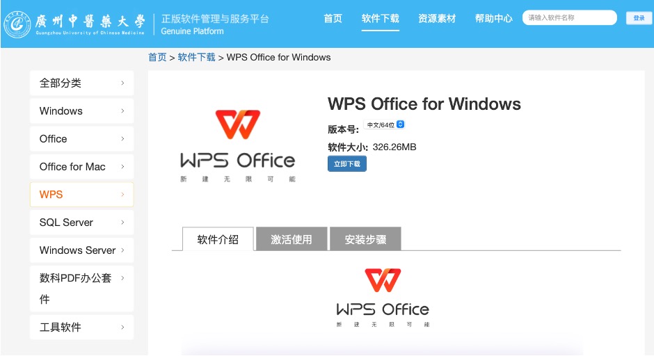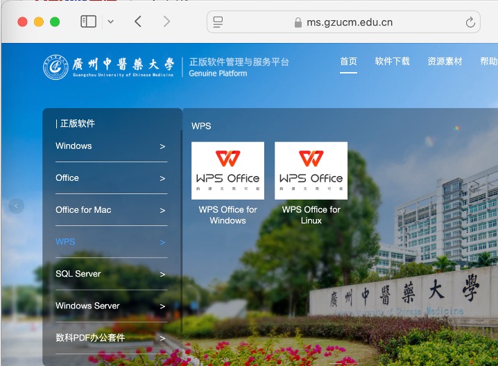 1、下载WPS 365教育版安装文件登录学校正版软件平台http://ms.gzucm.edu.cn依次选择“WPS”—“WPS365”