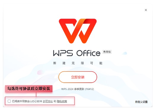直接双击进入安装流程,勾选金山协议许可,立即安装(安装时建议关闭WPS office)等运行中的软件程序,安装时间大约半分钟等待即可。