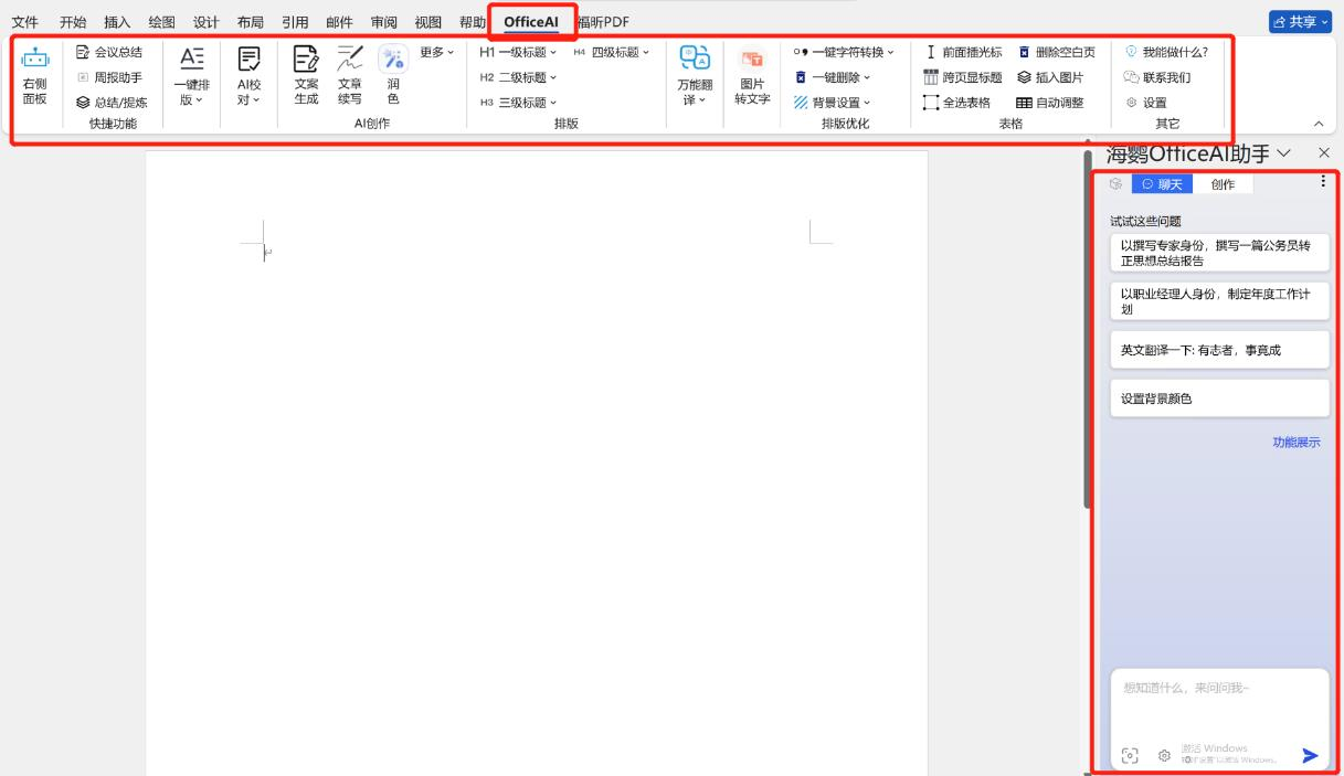 通过 Office AI 助手可以实现 AI 问答协助、文案生成、文章润色、翻译等功能。