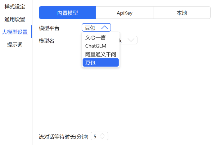 Office AI 助手默认内置有多个 AI 模型可供使用,如文心一言、智普、豆包等。