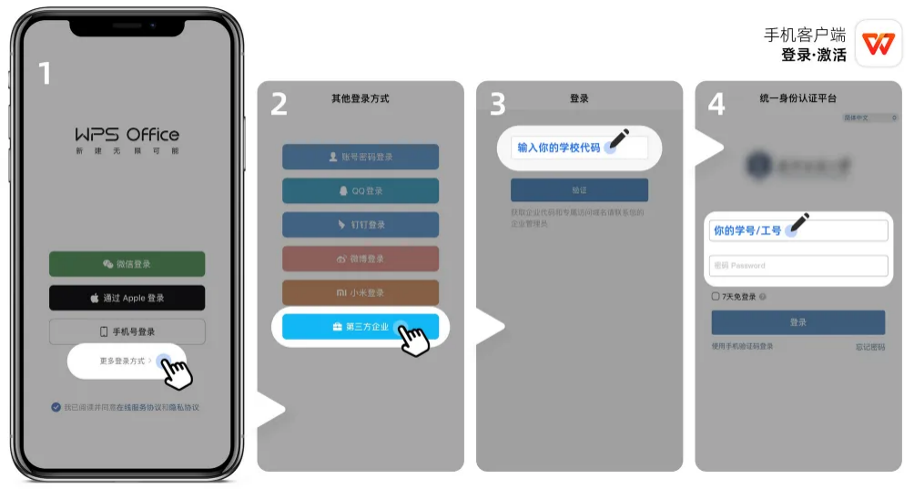手机WPS Office APP授权登录,步骤同PC端方式一致,仅显示界面略有区别。