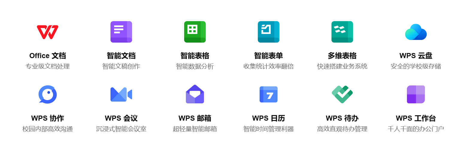 WPS 365 教育版(WPS Office+WPS协作) 是新一代办公学习套件 ,提供更加便捷、高效的数字化校园体验!可以帮助个人和团队,解决文档、信息散落问题,构建专属场景应用平台,促进学校教学、科研、管理等各项事务中协同办公效率的提高,守护校园数据资产安全。