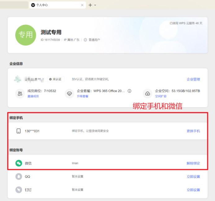 5.在个人中心(account.wps.cn)绑定微信/手机号,方便快捷登录